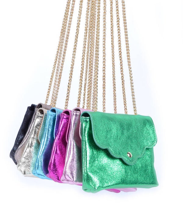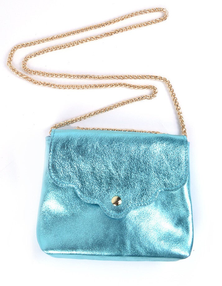 -Metallic schoudertasje met magneetsluiting. De tas heeft een ketting schouderband die je lang (enkel) of kort (dubbel) kan dragen. -Blauw (ook in donker roze, licht roze en lila) -Echt leer -Afmeting: 19 cm x 12,5cm x 4,5 cm